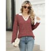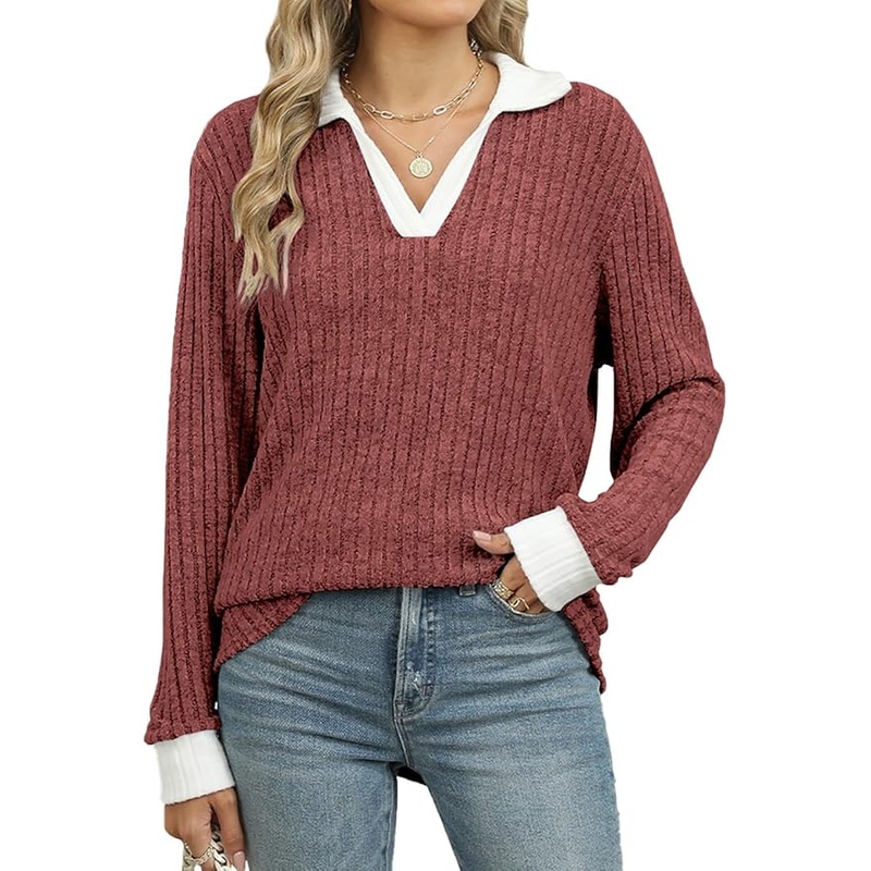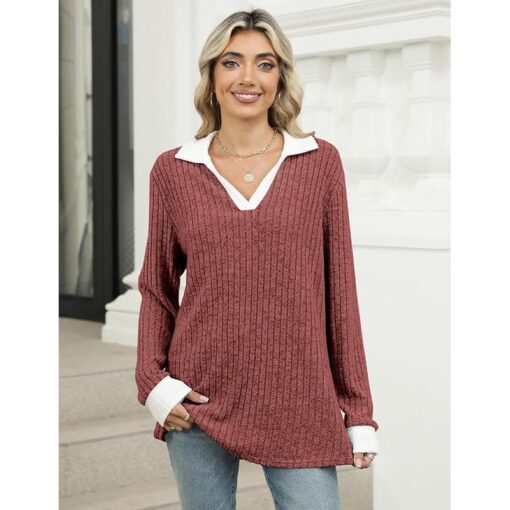 Gemulate Women’s V-Neck Long Sleeve Jumper Lightweight Ribbed Top – Caramel