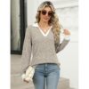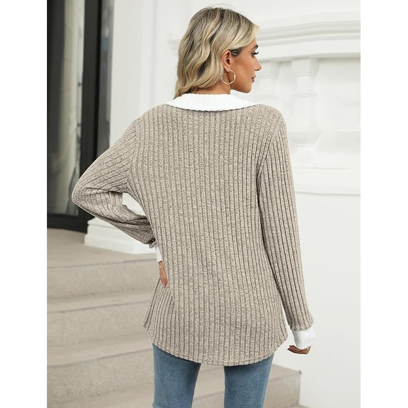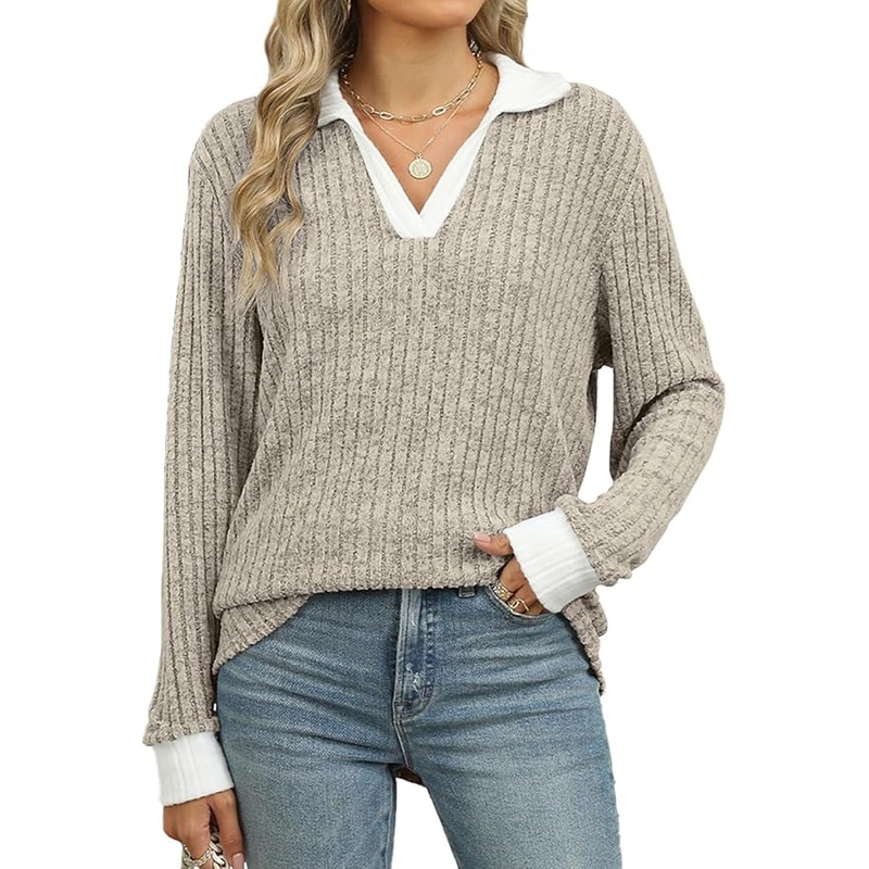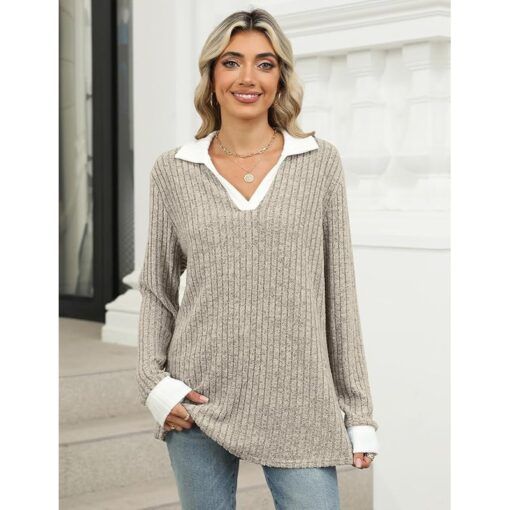 Gemulate Women’s V-Neck Long Sleeve Jumper Lightweight Ribbed Top – Khaki